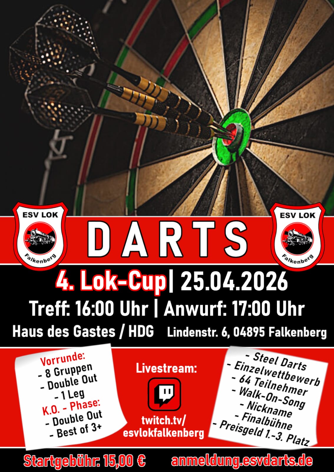 Zu den Feierlichkeiten „130 Jahre Sport in Falkenberg“ wurde erstmals ein Dartturnier durch den ESV Lok Falkenberg organisiert. Die Begeisterung für den Dartsport in Falkenberg war klar zu erkennen und so konnte im März 2024 die Abteilung Dart des ESV gegründet werden. Kurz darauf fand das zweite große Dartturnier im Haus des Gastes Falkenberg statt mit 64 Teilnehmern und einer Vielzahl an Zuschauern.